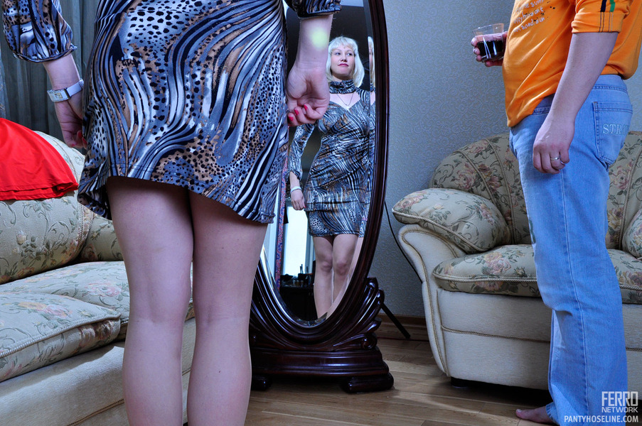 Naughty blonde trying on several pairs of nylon tights before wild coupling
